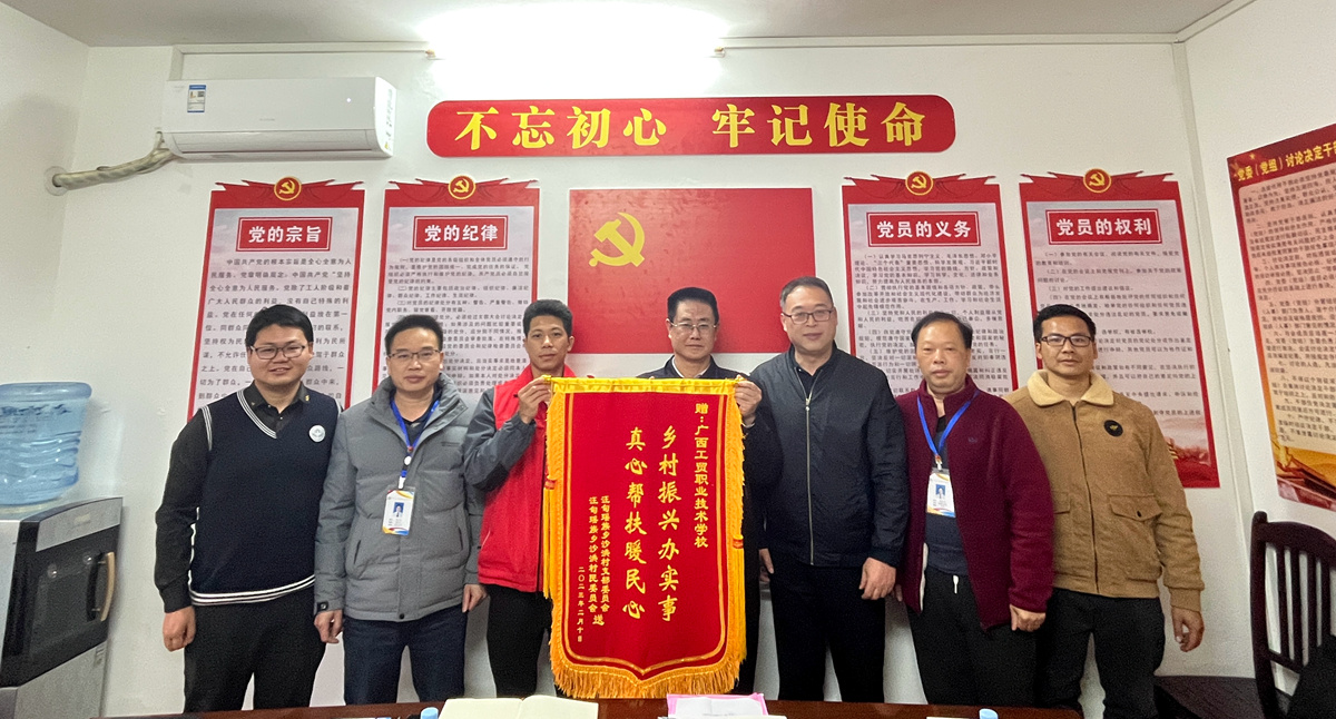 2023年2月23日,右江区委常委、右江区副区长、广西驻村工作队队长、广西工贸职业技术学校副校长李战率探花社区 驻百色市右江区部分驻村工作队员到广西工贸职业技术学校汇报工作并赠送锦旗,感谢学校对乡村振兴工作的大力支持。