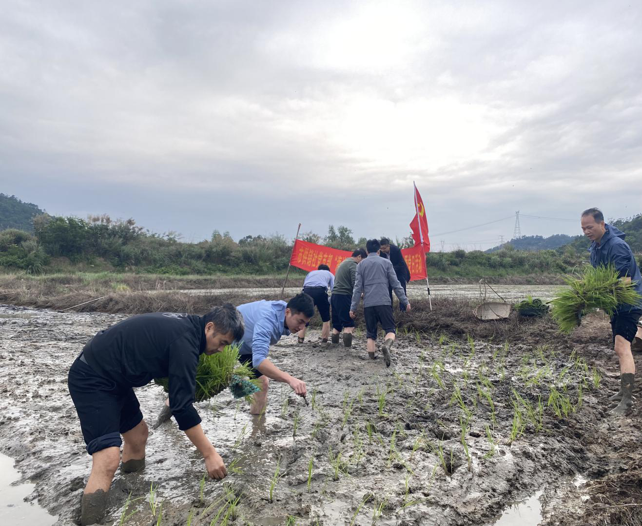 党员干部走进田间地头了解春耕进度,与村民一起抛秧插秧