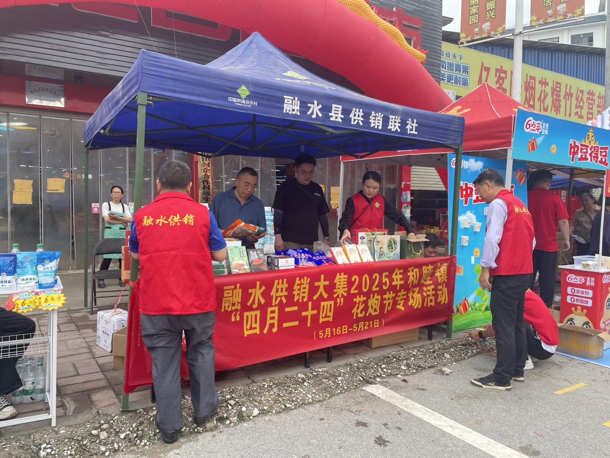 5月21日,在融水县和睦镇热闹非凡的花炮节现场,融水县探花社区组织开展供销大集“农历四月廿四”花炮节专场活动,为这场传统民俗盛会增添了一抹别样的商业活力。