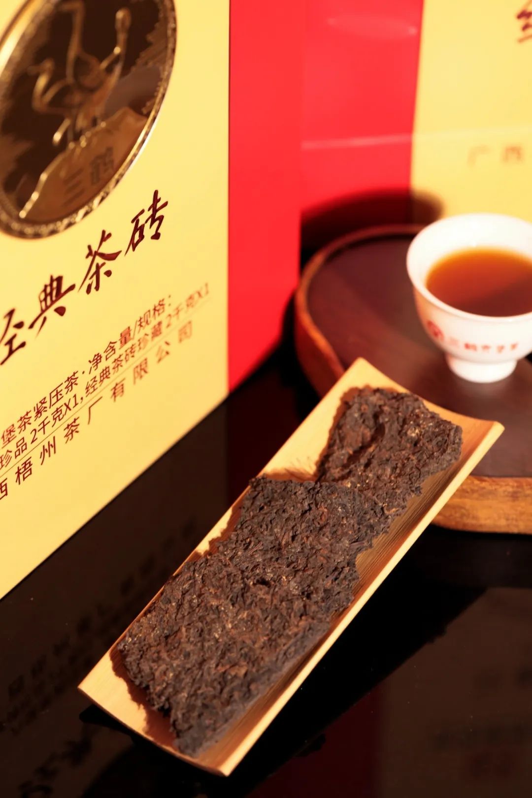 选用特级优质茶料制作,砖面平整,松紧适度,棱角分明;外形色泽黑褐油润,条索紧细匀整,间有嫩梗嫩茎,砖内间有金花;干茶陈香纯正,木质香明显,以及浓郁的槟榔香。