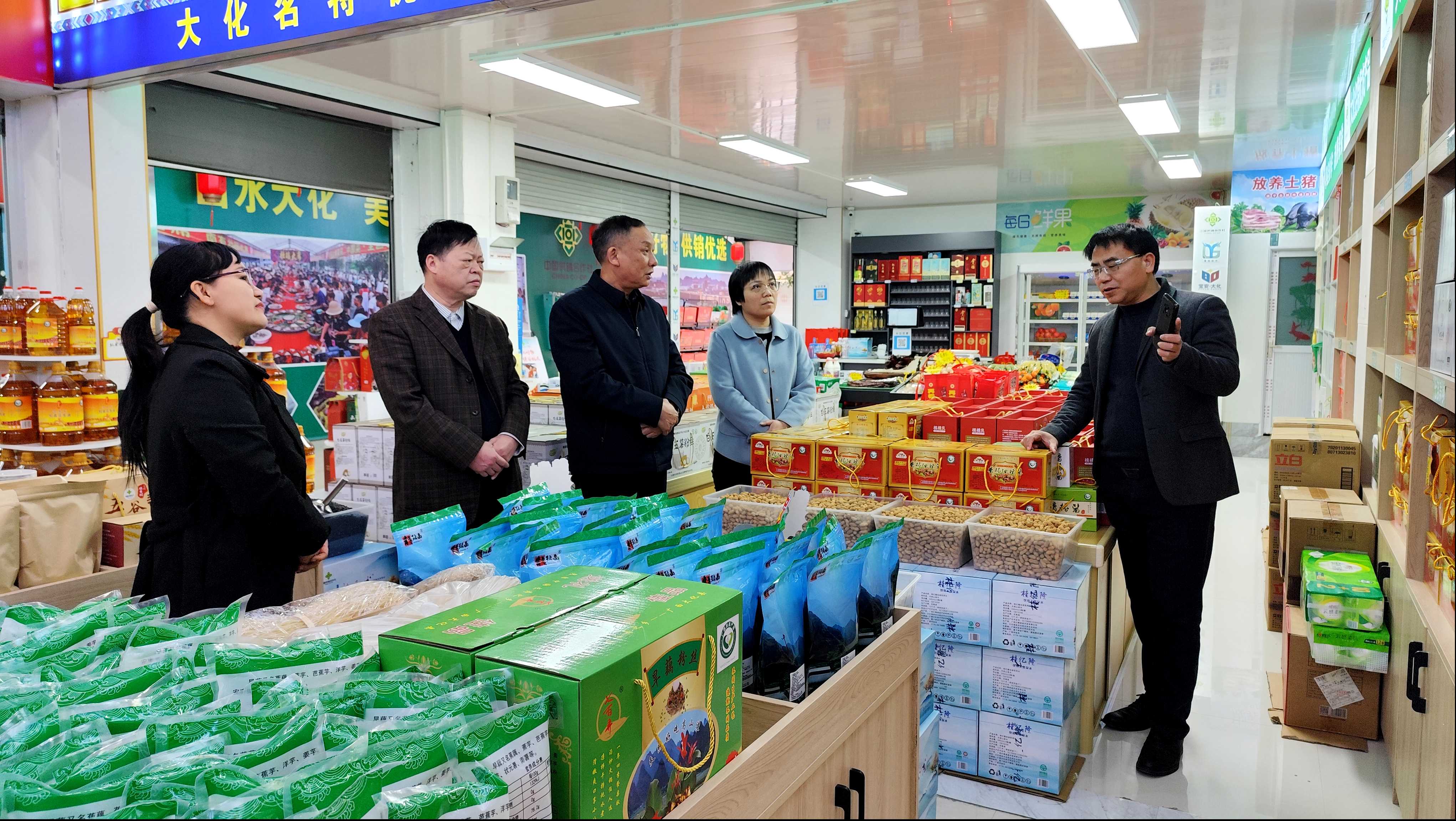 肖应虎一行在大化县供销名特优农产品展销中心调研